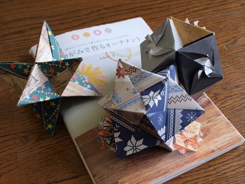 布施知子さんの本『おりがみで作るオーナメント』の中から、立体3種類を作ってみました。 この本を買ったのは1年くらい前で、その時に立体作りに挑戦したけどうまく作れずずっと放置していました。今ならできるんじゃないかと思い再トライ。出来ましたよ。…